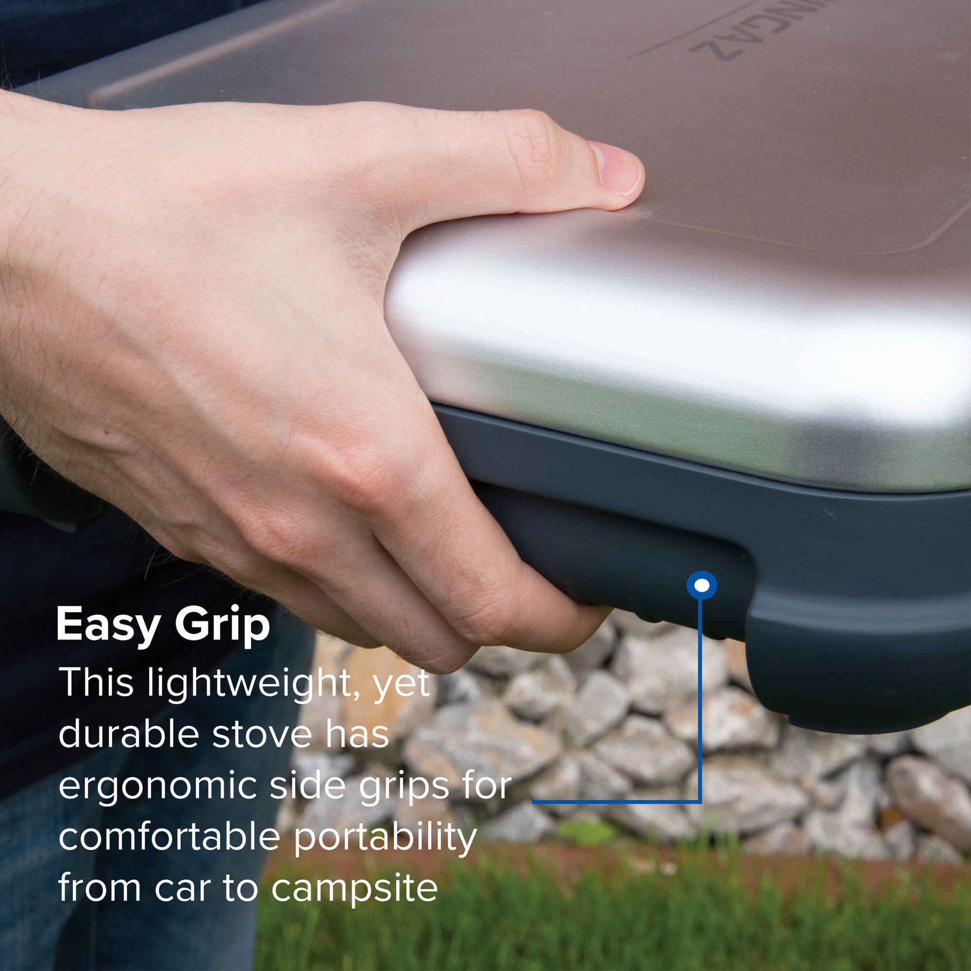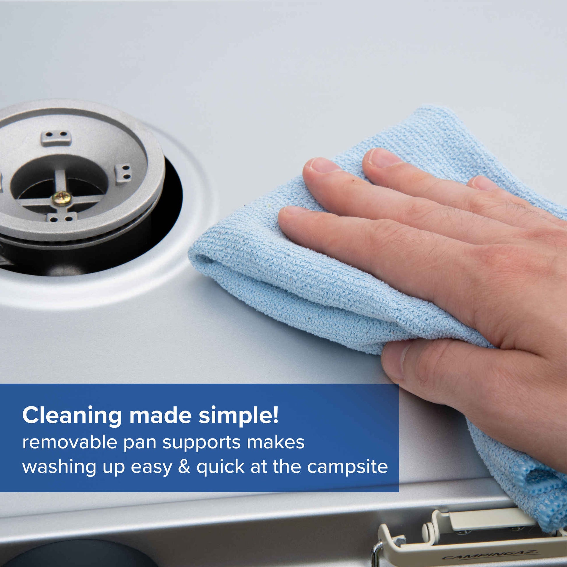 De emaljerade grytstöden är värmebeständiga, fungerar även som vindskydd och är lätta att ta bort för rengöring. Spisen rymmer två stekpannor eller kastruller med en diameter på upp till 24 cm. Med en vikt på endast 3,8 kg och en kompakt förpackningsstorlek är den enkel att transportera och förvara.