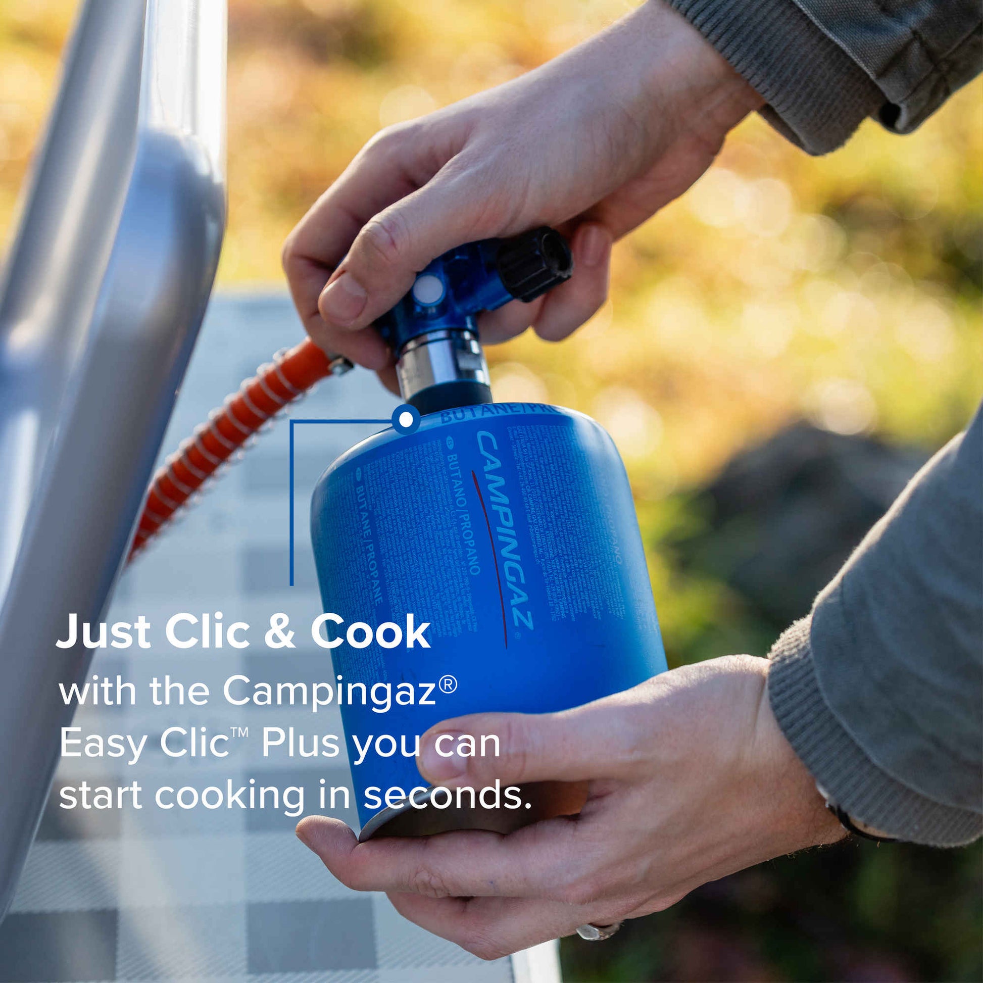 Tack vare den integrerade piezotändningen kan kaminen startas bekvämt och säkert med en knapptryckning – ingen tändare behövs. Easy Clic Plus-systemet möjliggör enkel och säker anslutning av Campingaz CV300 Plus- eller CV470 Plus-gaspatroner , som finns i hela Europa.